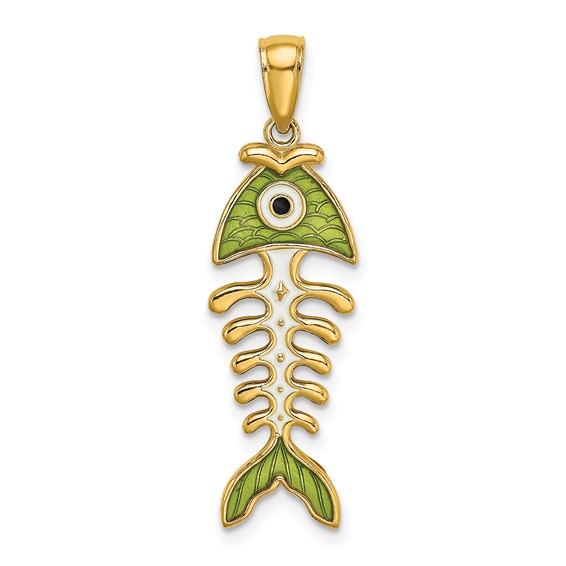 14kt yellow gold fishbone pendant has green enamel and is three dimensional. Size: 1in x 3/8in without bail. Fits up to a 3.5mm wide chain. Weight: 2.6 grams. Made in USA.