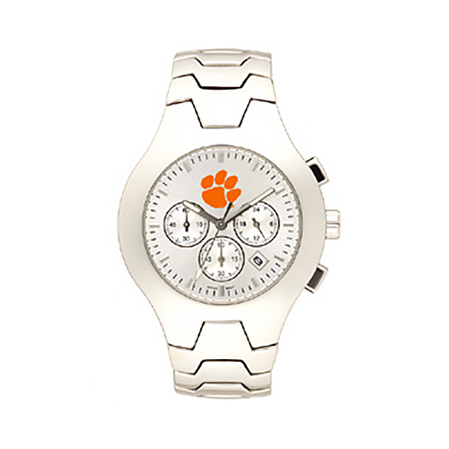 The men's Clemson University hall of fame watch has a polished stainless steel watch case with stainless steel oval-shaped chronograph pushers. The orange Clemson tiger paw logo is shown above the subdials. The Hall of Fame™ model features a Citizen® chronograph movement with date window and has Swiss luminous diamond cut hands. Solid stainless steel polished bracelet with butterfly clasp. The mineral glass lens has a non-reflective coating. Water-resistant to 10 ATM. Showcased in an aluminum gift box. Two year limited warranty.
