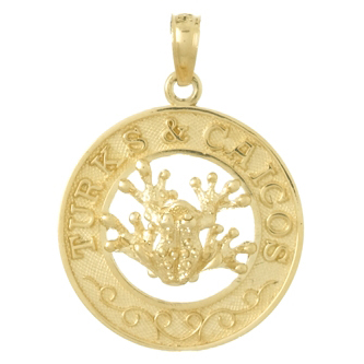 14kt yellow gold Turks and Caicos pendant with round frame and frog. Dimensions: 3/4in x 3/4in without bail. Weight: 2.6 grams. Made in USA.