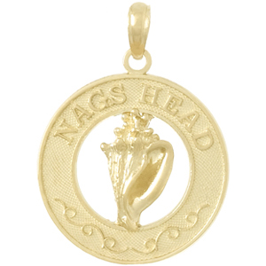 14k yellow gold Nags Head pendant has a conch shell in the middle. Dimensions: 3/4in x 3/4in without bail. This item is the size of a penny. Weight: 2.1 grams. Made in USA.