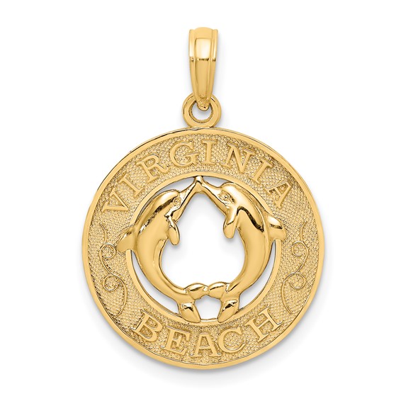14k yellow gold Virginia Beach pendant has two dolphins. Dimensions: 3/4in x 3/4in without bail. Weight: 2.0 grams. Made in USA.