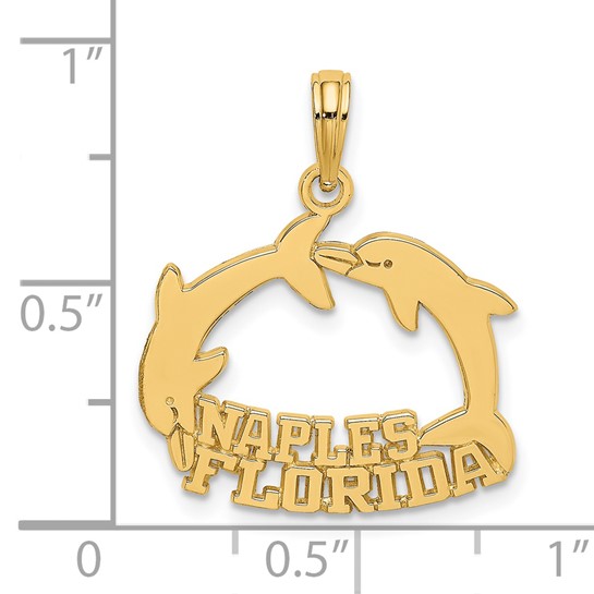 14kt yellow gold Naples Florida jumping dolphins pendant. Dimensions: 24mm x 20mm. Weight: 1.3 grams. Made in USA.