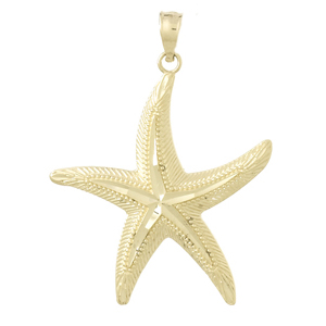 14kt yellow gold textured starfish pendant with diamond cut center. Dimensions: 1in x 1in without bail. Weight: 2.1 grams. Fits up to a 3mm wide chain. Made in the USA.