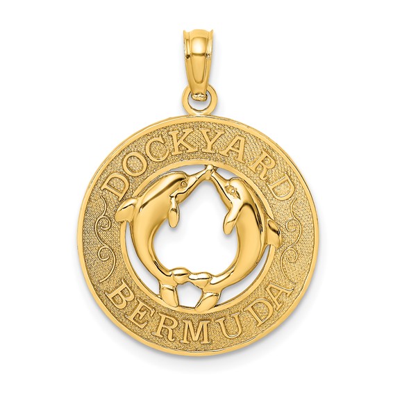 14k yellow gold Bermuda dockyard pendant has dolphins. Dimensions: 3/4in x 3/4in without bail. Fits up to a 3mm wide chain. Weight: 1.9 grams. Made in USA.