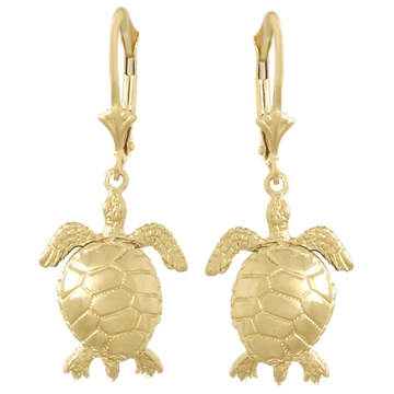 Moveable sea turtle lever back earrings are made of polished 14kt yellow gold. Earring size: 1 3/8in x 1/2in. Weight: 5.6 grams. Made in the USA.