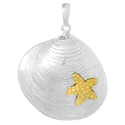 Sterling silver clam shell pendant with 14kt yellow gold starfish accent. Dimensions: 1in x 1in. Made in the USA.