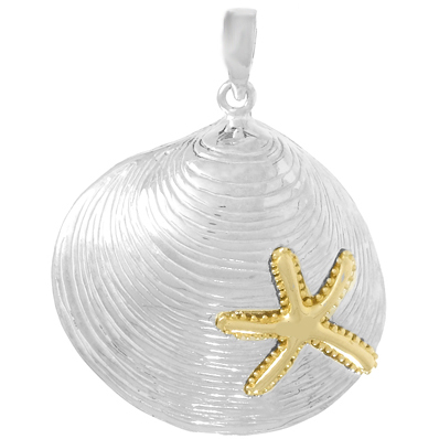 Sterling silver clam shell pendant with 14kt yellow gold beaded starfish accent. Dimensions: 1in x 1in. Made in the USA.