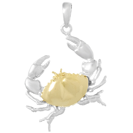 Sterling silver 3-D stone crab pendant has a 14kt yellow gold shell. Item size: 7/8in x 1in. Made in the USA.