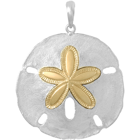 Sterling silver jumbo sand dollar pendant has a 14kt yellow gold center star accent. Dimensions: 1 3/8in diameter. Made in USA.