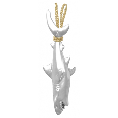 Sterling silver captured shark pendant has a 14kt yellow gold rope accent. Dimensions: 2in x 5/8in. This pendant is three dimensional. Chain fits through the rope accent. Made in USA.