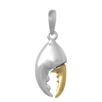Sterling silver moveable crab claw pendant has a 14kt yellow gold pincher. Dimensions: 28mm x 18mm including the bail. Made in the USA.