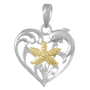 Sterling silver sea life heart pendant with 14kt yellow gold starfish in the center. Dimensions: 3/4in x 3/4in. Made in USA.