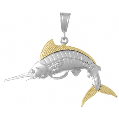 Sterling silver white marlin fish pendant has 14kt yellow gold accents. High polished. Dimensions: 1 3/4in x 1in. Made in USA.
