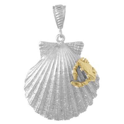 Sterling silver scallop shell pendant features a 14kt yellow gold crab accent. Item size: 1 1/8in x 1 1/8in. Made in USA.
