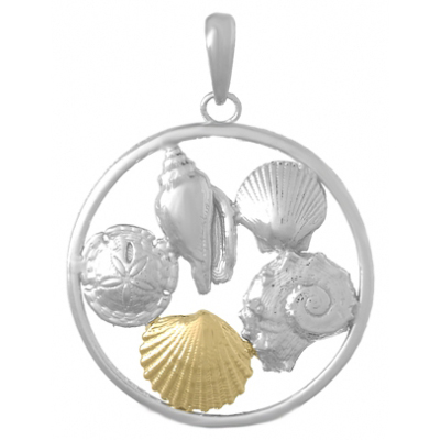 Sterling silver sea life cluster pendant with 14kt yellow gold shell. Dimensions: 1in x 1in. Made in the USA.
