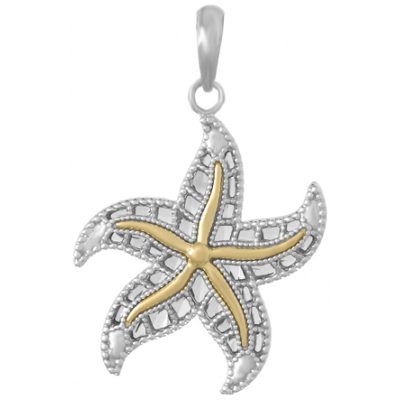 Sterling silver filigree starfish pendant has a 14kt yellow gold center. 2-D with closed back. Dimensions: 1in x 1in. Made in USA.
