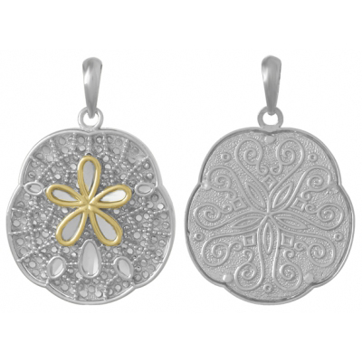 Sterling silver filigree sand dollar pendant with 14kt yellow gold center. Item size: 1in x 1in. Made in USA.