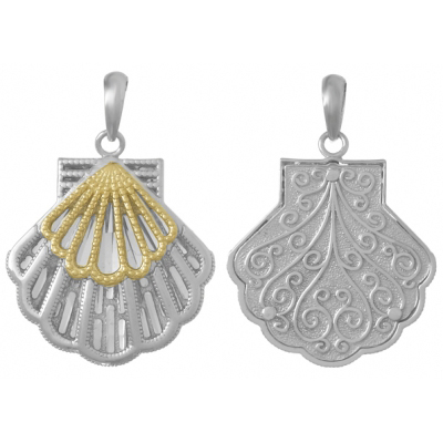 Sterling silver filigree scallop shell pendant with 14kt yellow gold accent. Dimensions: 1in x 1in. Made in the USA.