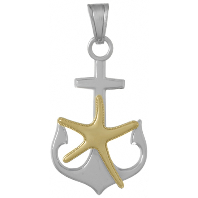 Sterling silver anchor pendant features a 14kt yellow gold simple starfish. Dimensions: 1 1/4in x 7/8in. Made in USA.