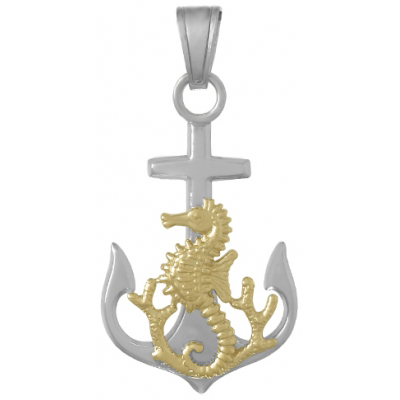 Sterling silver 2-D anchor pendant with 14kt yellow gold seahorse and coral. Dimensions: 1 1/4in x 7/8in. Made in USA.