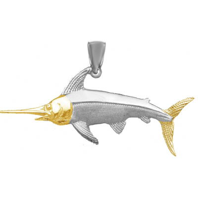 Sterling silver swordfish pendant has a 14kt yellow gold face and tail. Dimensions: 2 1/4in x 1in. Made in USA.