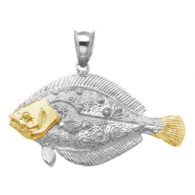 Sterling silver 2-D flounder pendant with 14k yellow gold face and tail. Dimensions: 1 5/8in x 7/8in. Made in the USA. Available while supplies last.