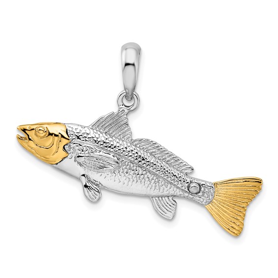 Sterling silver 2-D red drum fish pendant has a 14kt yellow gold face and tail. Dimensions: 1 1/2in x 5/8in. Handcrafted in the USA.