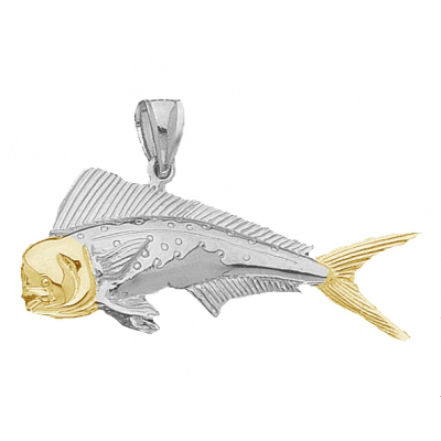 Sterling silver male mahi-mahi two dimensional fish pendant has a 14kt yellow gold face and tail. Dimensions: 1 3/4in x 3/4in. Handcrafted in the USA.