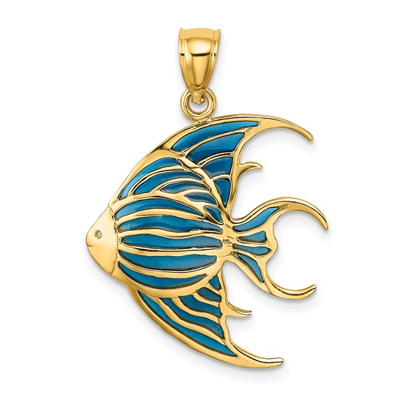 14kt yellow gold angelfish pendant with light blue translucent enamel. Item size: 7/8in x 7/8in without bail. Fits up to a 3mm wide chain. Weight: 1.7 grams. Made in Peru. Ships from USA.