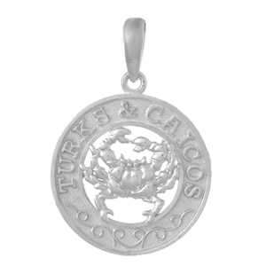 Sterling silver round Turks and Caicos pendant has a crab center. Item size: 3/4in x 3/4in. Weight: 1.8 grams. Made in the USA.