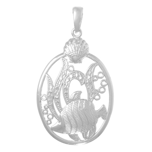 Sterling silver under the sea scene in oval frame pendant. Item size: 1 1/4in x 7/8in. Weight: 2.2 grams. Made in the USA.
