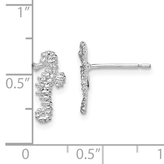 3-D mini seahorse post earrings are made of polished sterling silver. Item size: 1/2in x 1/4in. Push-on / pull-off backs. Weight: 0.8 grams. Made in USA.