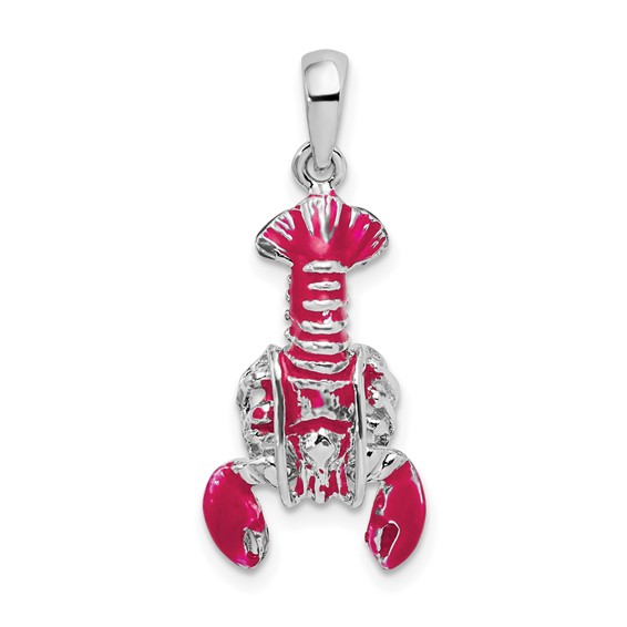 Sterling silver lobster pendant with orange enamel and moveable claws. Item size: 7/8in x 1/2in. Made in the USA.