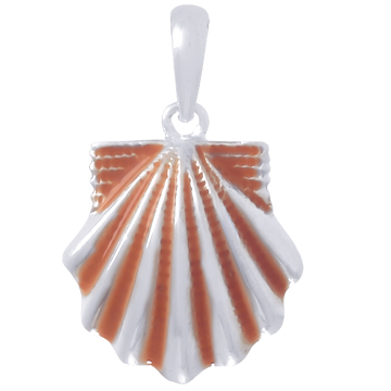 Sterling silver scallop shell pendant with tangerine enamel. Item size: 3/4in x 3/4in. Made in the USA.