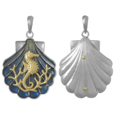 Sterling silver 2-D blue enamel shell pendant has a 14kt yellow gold seahorse scene. Dimensions: 1in x 1in. Made in the USA.