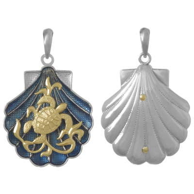Sterling silver 2-D blue enamel shell pendant with 14kt yellow gold sea turtle scene. Item size: 1in x 1in. Reversible. Made in USA.