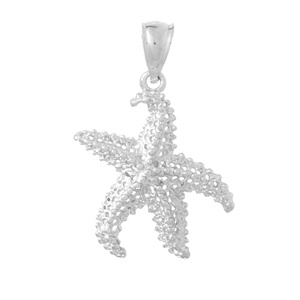 14kt white gold 2-D starfish pendant with lattice holes. Dimensions: 5/8in x 5/8in without bail. Weight: 1.4 grams. Made in the USA.