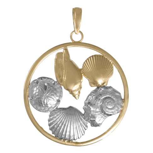 14k white and yellow gold five shell cluster pendant in a round frame. Dimensions: 32mm by 25mm. Weight: 2.5 grams. Made in Peru.