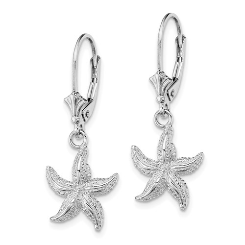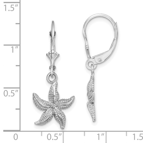 14k white gold starfish leverback earrings. Dimensions: 30mm by 13mm. Rhodium-plated to resist tarnishing and scratching. Weight: 2.5 grams. Made in USA.