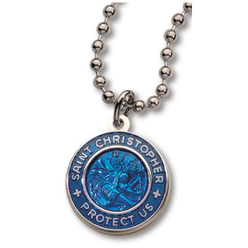 This electric blue Saint Christopher necklace is silver plated and hand enameled. It comes on an 18 inch ball chain. Individually carded. Medal measures 3/4 inch in diameter. Sold in a pack of two.