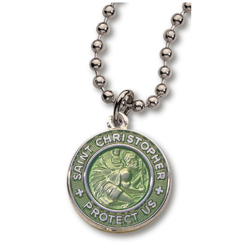 This light green Saint Christopher necklace is silver plated and hand enameled. It comes on an 18 inch ball chain. Individually carded. Medal measures 3/4 inch in diameter. Sold in a pack of two.
