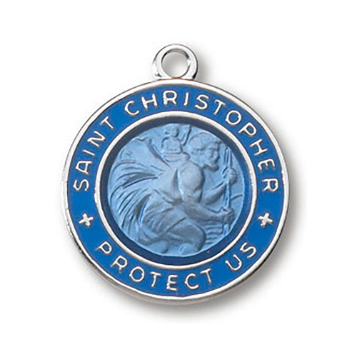 This round blue solid sterling silver Saint Christopher medal comes on an 18 inch medium weight stainless steel chain. Medal measures 3/4 inches in diameter. Deluxe gift boxed. Import.