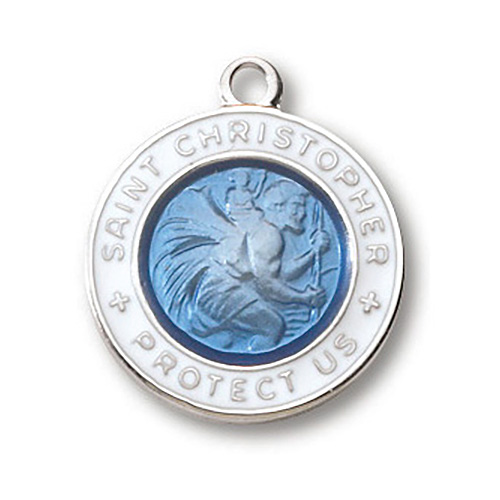 This ladies' blue and white sterling silver Saint Christopher necklace comes on an 18 inch medium weight stainless steel chain. Medal measures 3/4 inches in diameter. Deluxe gift boxed.