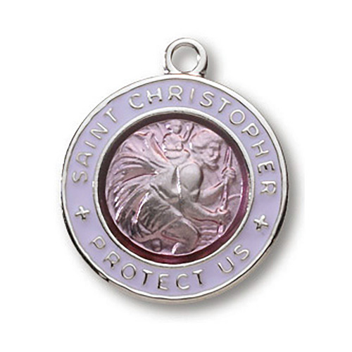 This ladies' lavender solid sterling silver Saint Christopher necklace comes on an 18 inch medium weight stainless steel chain. Medal measures 3/4 inches in diameter. Deluxe gift boxed.