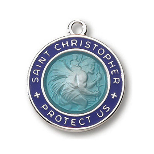 This light blue and dark blue solid sterling silver Saint Christopher necklace comes on an 18 inch medium weight stainless steel chain. Medal measures 3/4 inches in diameter. Deluxe gift boxed.