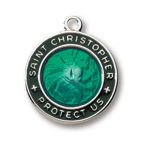 This green solid sterling silver Saint Christopher necklace comes on an 18 inch medium weight stainless steel chain. Medal measures 3/4 inches in diameter. Deluxe gift boxed.