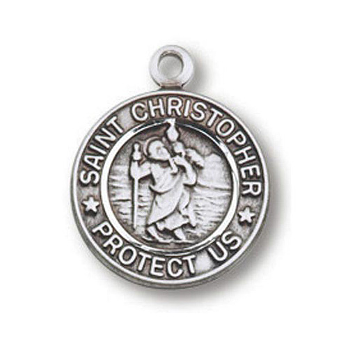 This very small solid sterling silver round Saint Christopher necklace comes on a 16 inch light weight silver plated chain. Medal measures 1/2 inch in diameter. Deluxe gift boxed.