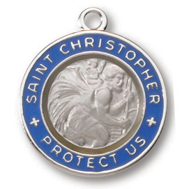 This solid sterling silver Saint Christopher necklace with blue enamel comes on an 18 inch medium weight stainless steel chain. Medal measures 3/4 inch in diameter. Deluxe gift boxed.