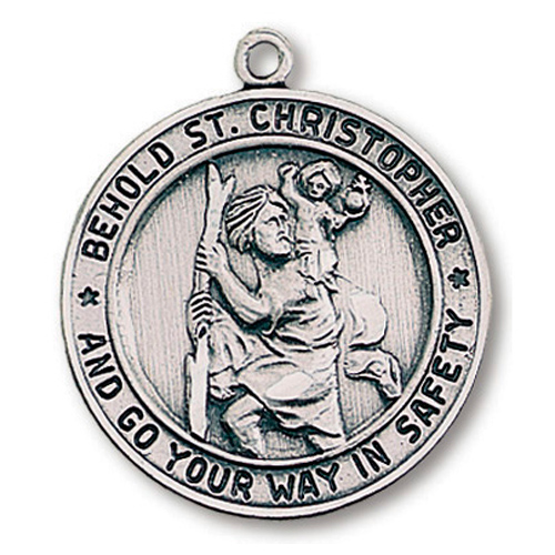This solid sterling silver Saint Christopher necklace comes on an 24 inch heavy weight stainless steel chain. Medal measures 1 inch in diameter. Inscription: BEHOLD ST. CHRISTOPHER AND GO YOUR WAY IN SAFETY. Deluxe gift boxed.