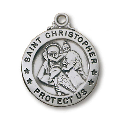 This solid sterling silver Saint Christopher Protect Us medal measures 3/4 inch in diameter and comes on an 18 inch medium weight stainless steel chain. Deluxe gift boxed.